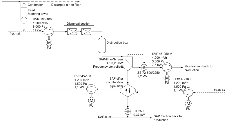 The material exits the metering tower directly into the dispersal duct. The special fan sucks the mixture of fibrous fluff surrounding the SAP granules from the dosing roller of the feed tower. The high-pressure fan is designed to transport material through the open impeller. It is driven by a frequency-controlled motor.