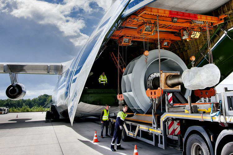 Normalerweise treten die Ventilatoren vom 40 Kilometer entfernten Hafen in Hamm ihre Reise zu anderen Kontinenten an – und gelangen über den Dortmund-Ems-Kanal zu den großen Häfen Rotterdam, Hamburg oder Antwerpen. Nur manchmal, wenn es ganz schnell gehen muss, weil jeder Ausfalltag beim Kunden Millionen kosten kann, ist der schwimmende Transport zu langsam. Dann hebt so ein Riesen-Venti per Flugzeug ab. Nicht mit irgendeinem. Sondern mit der russischen Antonov An-225, dem größten Flugzeug der Welt.