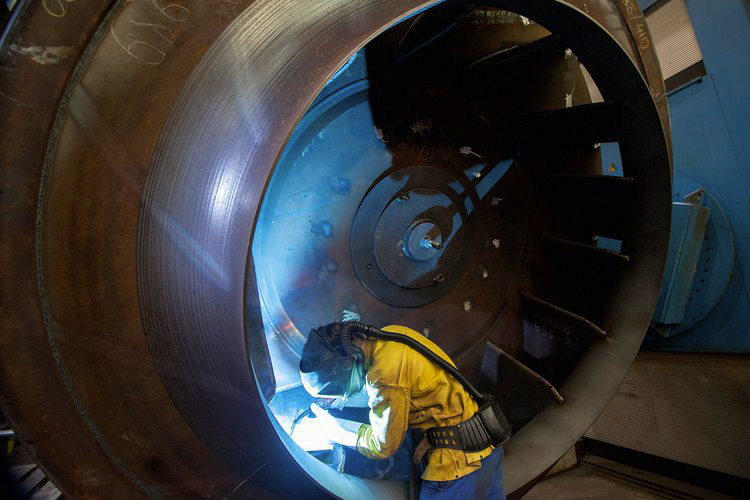 Mit ruhiger Hand zieht Dennis Tissen eine perfekte Schweißnaht, verbindet die Schaufel mit der mehr als mannshohen Deckscheibe des Laufrads. Es sind Bauteile eines Ventilators. Noch ein Monat Arbeit liegt vor dem Anlagenmechaniker, bis der tonnenschwere Venti – so die Kurzbezeichnung – seine Reise zu einem fernen Land antreten wird: "Ich muss mit Geduld und Gründlichkeit arbeiten, damit das Ding am Ende ruhig und standfest läuft." Tissen gehört zu den 250 Mitarbeitern der Ventilatorenfabrik Oelde im Münsterland. Die erwirtschaftet jährlich rund 60 Millionen Euro mit kompletten lufttechnischen Anlagen sowie Industrie-Ventis.