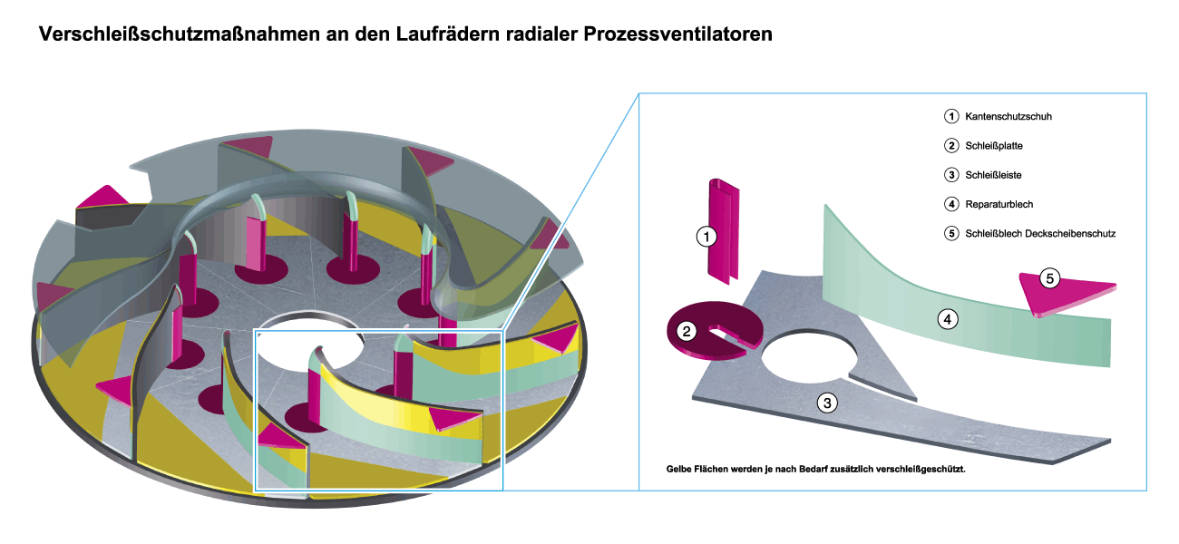 Auch mit dem besten Verschleißschutz müssen nach längerer Betriebszeit die kritischen Bereiche an den Rotoren der radialen Prozessventilatoren regelmäßig kontrolliert werden. Gegebenenfalls sind die verschlissenen Bereiche des Rotors nachzupanzern.